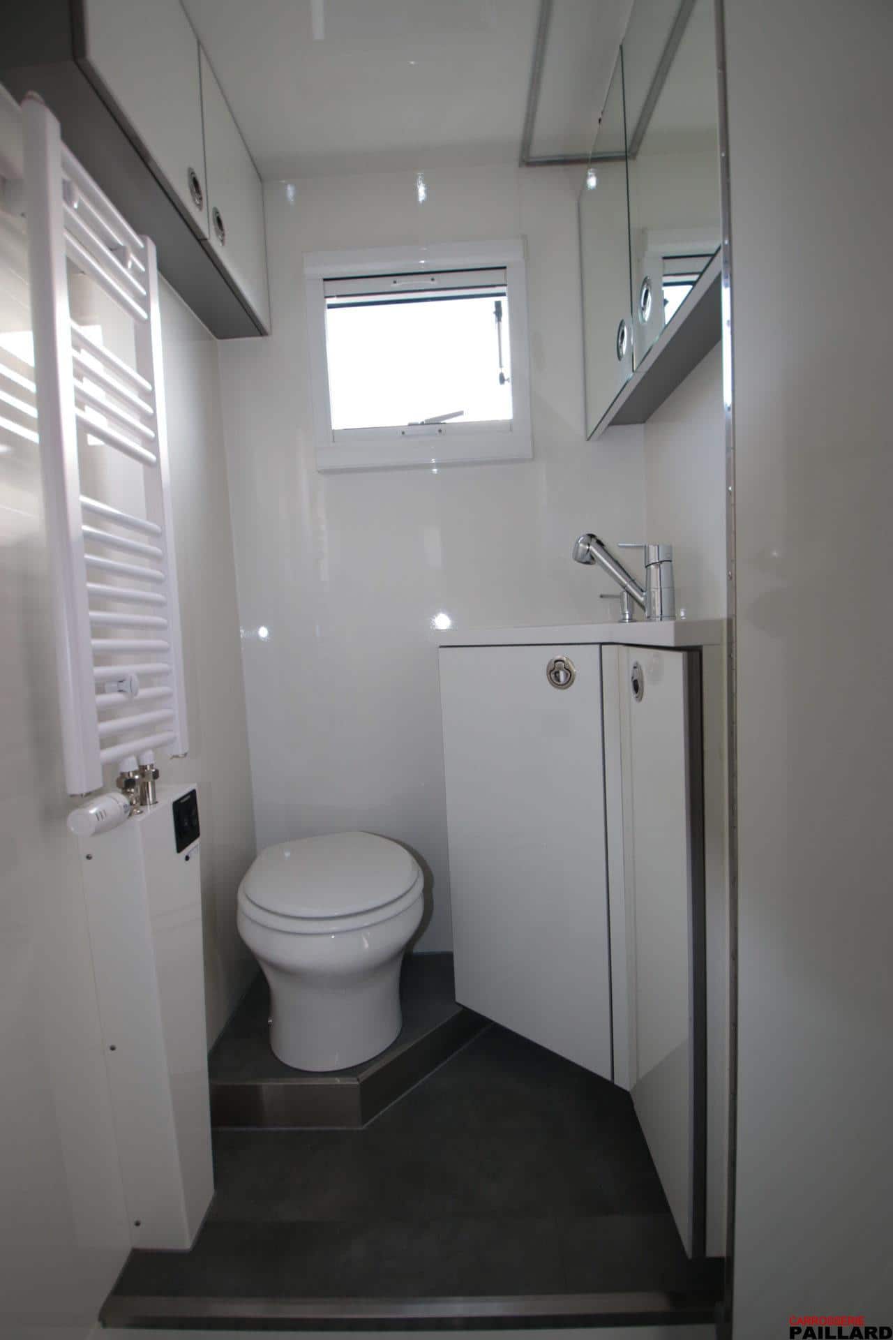 - Cabinet de toilette de 0.90m de long avec WC à broyeur électrique avec 150L d’eau noir et lavabo