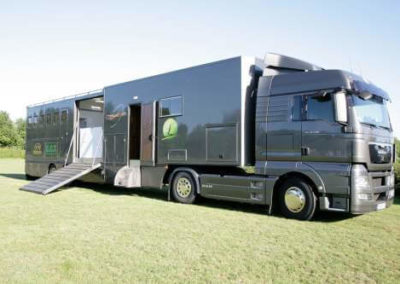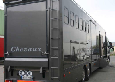 Ce camion-chevaux poids lourd a la particularité d’avoir deux espaces camping et un embarquement arrière et latéral.